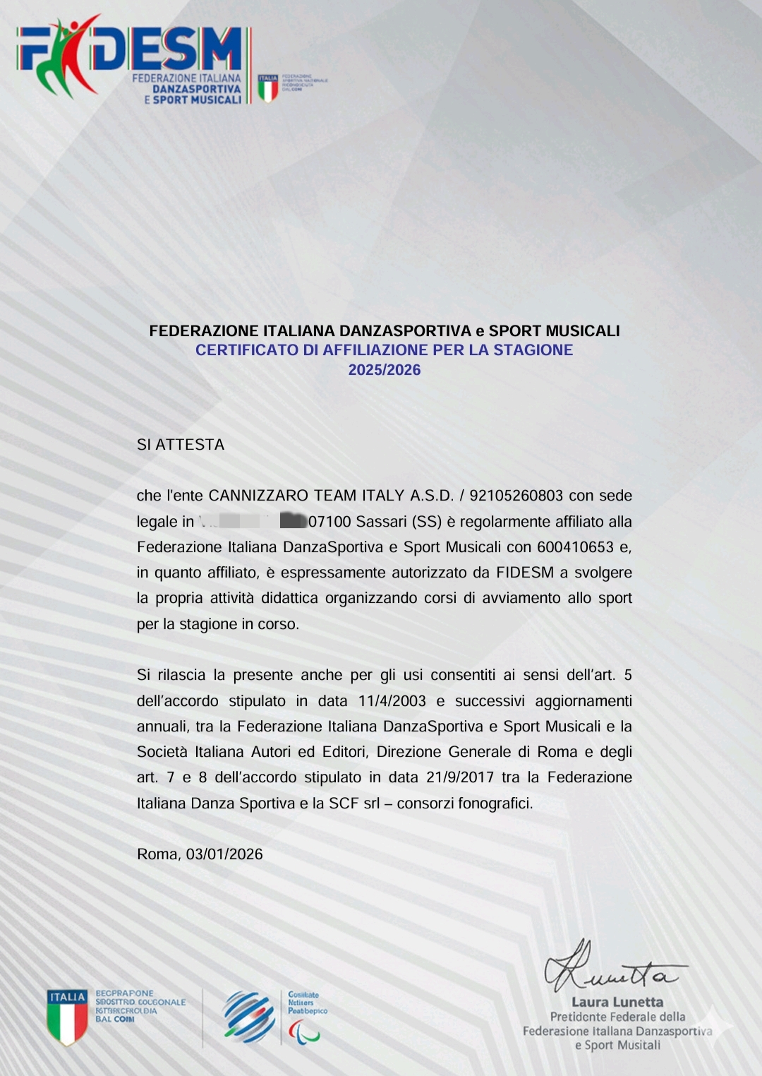 Associazione Sportiva Dilettantistica affiliata alla FIDESM Federazione Italiana DanzaSportiva e Sport Musicali del C.O.N.I.